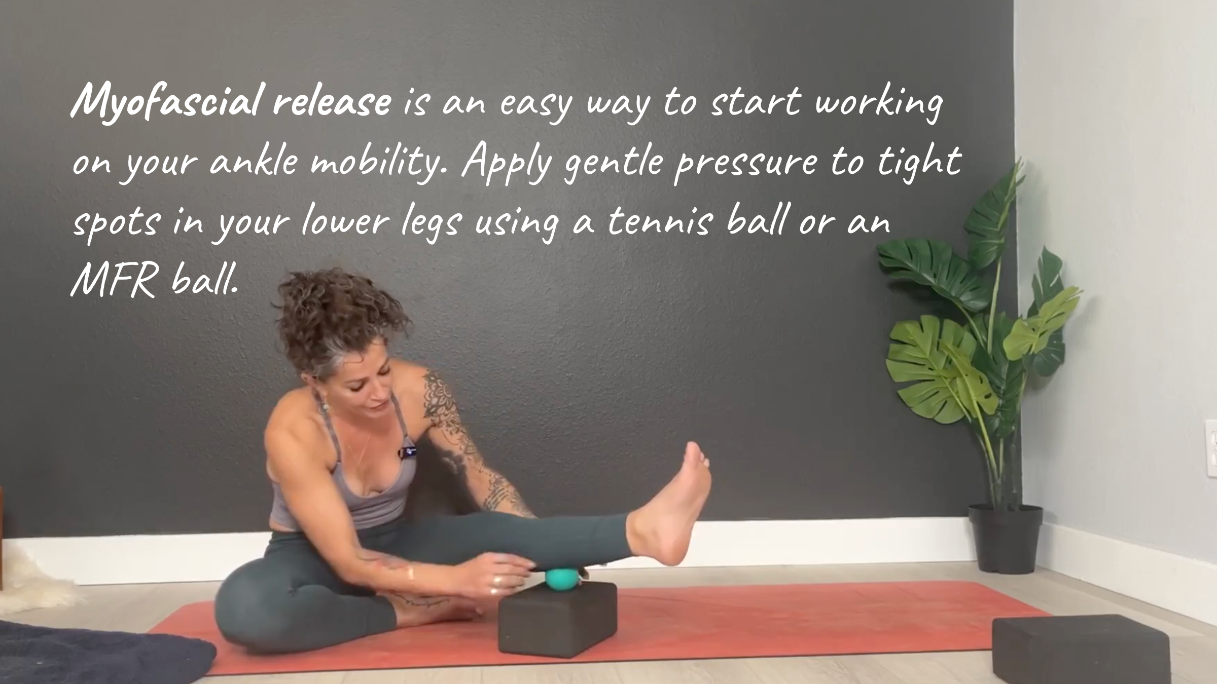Myofascial release is an easy and effective way to start working on your ankle mobility. By applying gentle pressure to tight spots in your lower legs using a tennis ball or an MFR ball, you can help your tissues release, which in turn will allow your ankles to sink closer to the mat.
