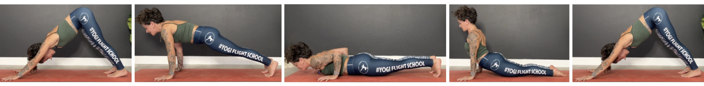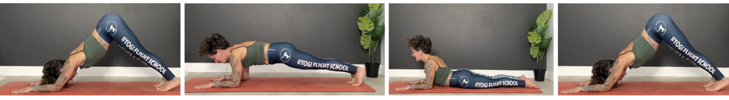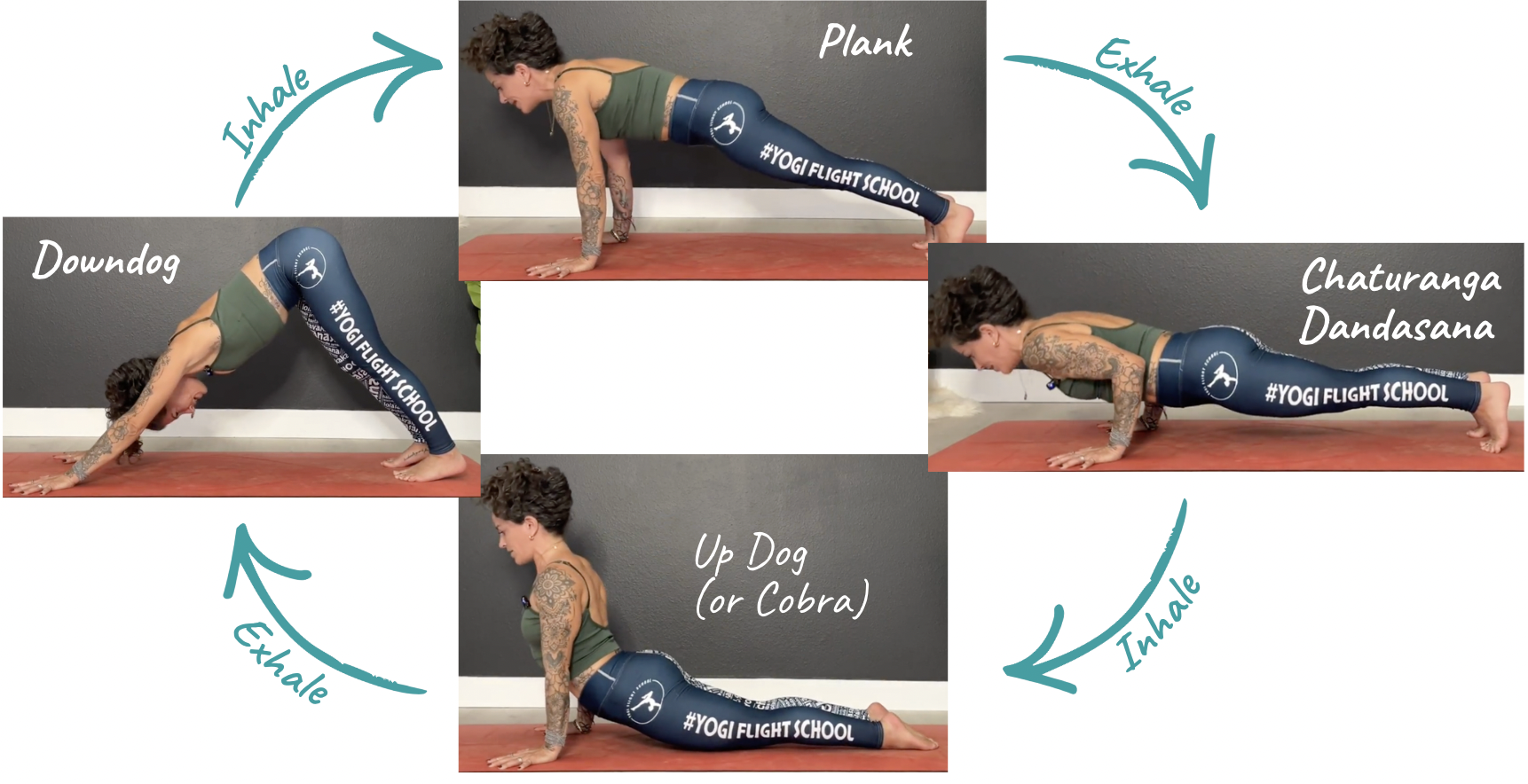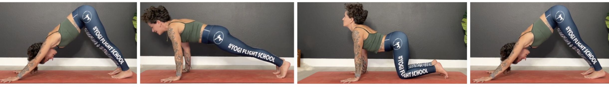 Today we’re focusing on the physical definition of vinyasa - the actual sequence of poses you often hear called out in yoga class. A typical vinyasa from downward-facing dog looks like this: